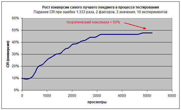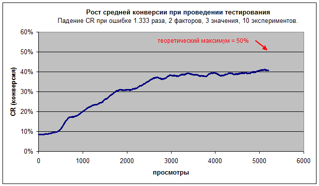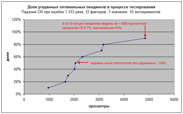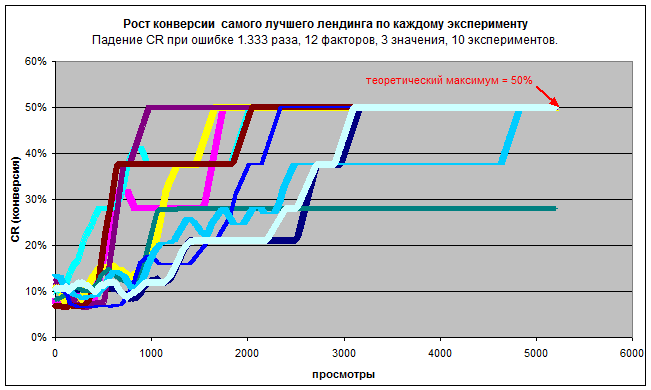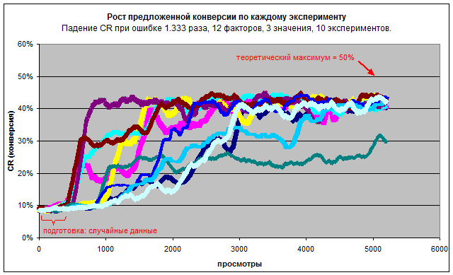 Варианты конверсии для разных частичных совпадений выглядят так: 0,0,0,0,0,0,0,0,0,0,0,0 CR=50.00% - одна из набора "лучших" комбинаций 0,0,0,0,0,0,0,0,0,0,0,* CR=37.51% - один не угадали - в 1.333 раза хуже предыдущей 0,0,0,0,0,0,0,0,0,0,*,* CR=28.14% - два не угадали - еще в 1.333 раза хуже предыдущей, т.д. 0,0,0,0,0,0,0,0,0,*,*,* CR=21.11% 0,0,0,0,0,0,0,0,*,*,*,* CR=15.84% 0,0,0,0,0,0,0,*,*,*,*,* CR=11.88% 0,0,0,0,0,0,*,*,*,*,*,* CR=8.91% 0,0,0,0,0,*,*,*,*,*,*,* CR=6.69% 0,0,0,0,*,*,*,*,*,*,*,* CR=5.02% 0,0,0,*,*,*,*,*,*,*,*,* CR=3.76% 0,0,*,*,*,*,*,*,*,*,*,* CR=2.82% 0,*,*,*,*,*,*,*,*,*,*,* CR=2.12% Т.к. мы иcпользуем не очень большое число значений, при случайном розыгрыше значений средняя конверсия будет 8.7% за счет случайного выпадения пятерок, шестерок т.д. Наша цель - угадать одну из самых лучших комбинаций. Задача с одной лучшей комбинацией может быть решена и наивным методом в предположении о независимости факторов - при случайном розыгрыше значений совпадения с нулем будут давать плюс в конверсию, если не совпало - конверсия ниже. Такая задача слишком проста. Поэтому для усложения модели возьмем 3 старших комбинации, которые не пересекаются (три раза одинаковые значения: 0,1,2), вероятность берется максимальной по всем сравнениям со всеми старшими комбинациями - эту задачу не решить наивным методом. Запускается десять одинаковых экспериментов. Конверсия, которая соответствует предложенным системой лендингам, в ходе тестирования увеличивается так: